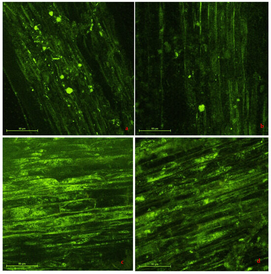The leaves and roots of alfalfa were visualised using a confocal laser scanning microscope (CLSM, Nikon Eclipse Ti-E) configured with an A1 R MP microscope system and equipped with a digital sight DS-U3 camera (Nikon, Tokyo, Japan). Small pieces of the samples, together with distilled water, were observed at 600× magnification [34]. For the hermetic sealing of the sample, glue was used, and dyes were not used.