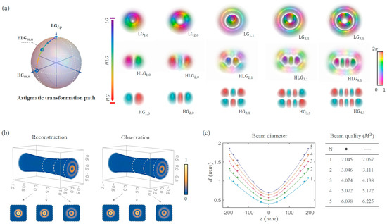 where , and are the Rayleigh length, beam waist, and radius of curvature, respectively. and denote the Laguerre and Hermite polynomials, respectively. The term is the propagation-dependent Gouy phase, and their modal orders are defined as . The above Hermite– and Laguerre–Gaussian mode families have their own special features in transverse structures but have the same fundamental TEM00 mode, and each can independently constitute a unique and unbounded 2D Hilbert space. Therefore, in principle, we can represent any Gaussian mode by using coherent superpositions (i.e., complex series) of LG, HG, or their intermediate Hermite–Laguerre–Gaussian (HLG) modes. i.e., the generalized Hermite–Laguerre–Gaussian (HLG) mode. All the possible N-order HLG modes following the relation can form the surface of a unit sphere, called a modal sphere, and unitary transformations for states on the sphere can be realized by using astigmatic operations.