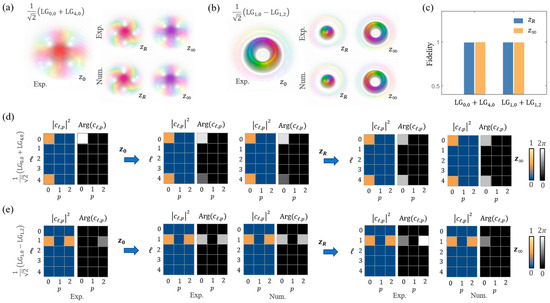 Finally, beyond morphological observations, we can further derive the modal constitution of light fields (i.e., quantum state or density matrix) in terms of spatial degrees of freedom. This task is usually accomplished by using quantum state tomography [19,20], which requires multiple projections on all mutually unbiased bases, leading to a complicated and time-consuming operation, especially for high-dimensional states. Moreover, recent works showed that astigmatic operation and machine-learning-based pattern recognition can also be used to determine simple OAM superimposition states [32,33]. In contrast, the SCA characterization provides complete information on light fields and, thus, enables the direct and easy determination of the complex-valued modal spectrum by computing projections on a complete orthogonal basis, such as the LG basis set; see Appendix B. This capability has great potential for applications in high-dimensional state characterization and optical topology [20,34,35,36,37,38]. Additionally, this enables us to conveniently analyze and predict the beam evolution of the light fields mentioned above from an algebraic viewpoint [30,31]. For instance, Figure 3d,e show the computed modal constitutions (i.e., the LG modal complex spectra ) of the two superposed modes, respectively. It was shown that the modal weights (or power spectrum) remained constant upon propagation, i.e., , while the intramodal phase between two successive LG components, due to unsynchronized Gouy phase accumulation, varied from to when arriving and finally backed to 0 (or ) at the far field . This analysis clearly shows the mechanism of beam evolution and revival upon diffraction from an algebra perspective, which, in fact, exists widely in compounded systems undergoing unitary transformations [30,39,40]. In addition, the modal constitutions of HLG modes in Figure 2a are provided in Appendix B, showing that each mode has an identical modal order and, thus, is propagation-invariant.