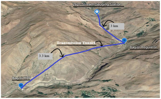 Bagisli HPP, which is located in Hakkari Province, was commissioned in 2009. The exact location of the HPP is within 37°42′49″–37°43′55″ northern latitudes and 44°03′17″–44°05′09″ east longitudes. The rain area is approximately 2889 km2. The installed capacity of the HPP is 30 MW and its estimated energy generation is 100 GWh/year [36]. The project area is mainly composed of a regulator that stores and regulates the water, transmission tunnels, penstock, and power house. Figure 2 illustrates the locations of the stream gauging station numbered 2621 and the length of the transmission tunnels. While the distance between the gauging station and the regulator is 3 km, the distance between the regulator and the power house is nearly 3.3 km. The stored water in the regulator is transferred via a transmission tunnel along the 3.3 km.