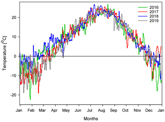 It can be deduced from Figure 3 that the mean air temperatures of the area in the summer season, including June, July, and August, are increasing for the successive years studied. In 2016, the mean temperature of the summer months was 20.1 °C, while this value was calculated as 21.06 °C in 2017, 21.25 °C in 2018, and 21.43 °C in 2019. Considering the years examined, partial increases were observed in the mean temperatures of the summer months. On the contrary, although there were no significant changes in the mean temperatures of the winter months consisting of December, January, and February in the years examined, while the mean temperature of the relevant months was around −6 °C, this value increased in 2018 and was calculated as −1.8 °C.