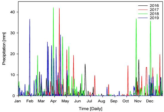 The precipitation data for the examined area were acquired from the Turkish State Meteorological Service for the period of 2016 to 2019 [22]. The data were collected at certain geographical coordinates, namely 37°47′15″ northern latitudes and 44°07′23″ east longitudes. The gauging station, which is the closest station to the stream gauging station, is also located at a distance of 5 km from the stream gauging station as the air temperature measurement station. The distance between the station where precipitation measurements were obtained and the HPP under examination is approximately 8 km. The data obtained from the designated official station provide an overview of the precipitation patterns in the studied region. Figure 4 represents the daily precipitation of the studied area in mm, for the time range of 2016–2019. The concentration of precipitation occurs mostly throughout the winter and spring seasons, namely from November to May, accounting for around 90% of the total annual precipitation. The yearly total precipitation ranges from 220 mm to 530 mm, while the monthly mean precipitation varies between 20 mm and 43 mm. Notably, in the period spanning from 2016 to 2019, 2016 experienced the lowest total precipitation, whereas 2018 recorded the highest total precipitation. A considerable proportion of the yearly precipitation is mostly in the form of rainfall, with the exception of the elevated areas where snowfall persists, but with lesser significance. The studied location has a high precipitation season throughout the spring period, with peak precipitation often occurring in the month of April. In the summer season, which consists of the months of June, July, and August, the precipitation goes down to its lowest values.
