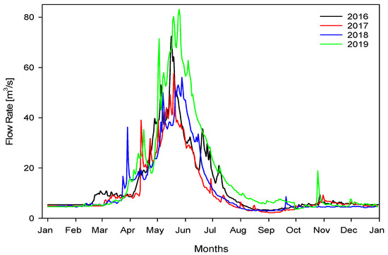 Figure 5 demonstrates the recorded daily flow rates via the stream gauge station located in the Zap River, for the range of 2016–2019. The mean flow rates for the given time interval showed that the minimum and maximum monthly total flow rates were 87 m3/s in September 2017 and 1972.8 m3/s in May 2019, respectively. Additionally, the monthly mean flow rate for four years is 381.2 m3/s. In terms of the annual mean flow rates, the lowest value was recorded in 2017 at 315 m3/s, while the highest value was recorded in 2019 at 510 m3/s. The long-term daily mean flow rate is obtained as 11.46 m3/s for the 60 years, while it is 12.53 m3/s for the studied time interval. The difference between the two flow rate values is not significant for the examination of the studied project field. It can be seen in Figure 6 that from October to the end of February, nearly a constant flow occurred. The flow rates peak in June and exhibit a steep upward trend starting from March. The daily average flows declined from the end of June, exhibiting a similar pattern to that seen between March and June, but in a decreasing form. It may be derived from the figure that the plots of 2018 and 2019 demonstrate a shifting trend to July according to the other years. The possible reason behind this shift may be the changing precipitation characteristics of the studied field.