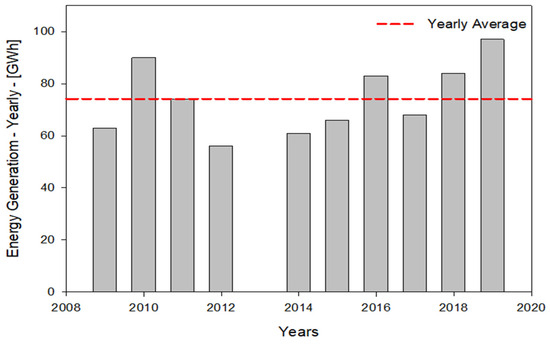 The energy generation characteristics of Bagisli HPP are determined using the hourly energy generation data obtained from Energy Exchange Istanbul (EXIST), which is an energy exchange company founded in 2015 and licensed by the Energy Markets Regulatory Authority (EMRA) of Turkey [38]. Bagisli HPP has been generating energy since 2009, and the energy generation values for the operated years, within the unavailability of the values of 2013, are given in Figure 6. The maximum yearly energy generation occurred in 2019 with 98 GWh, while the minimum was in 2012 with 56 GWh. The difference between maximum and minimum energy generation is 42 GWh, which is 75% higher than the minimum energy generation value. The mean annual energy output for all years of generation was 74 GWh. The amount is around 25% less than the estimated total annual energy generation capacity of 100 GWh, as mentioned in the project file. Upon analyzing the data from 2016 to 2019, it was determined that the mean annual energy output equaled nearly 84 GWh. The amount of energy generated closest to the expected energy generation value stated in the project file was achieved in 2019 and recorded as 98 GWh. The figure shows that energy generation from Bagisli HPP exhibited a fluctuating characteristic. The possible reasons behind these fluctuations may be the freezing of the stored water in the regulator due to the low level, insufficient rains, maintenance, and the duration of summer seasons.