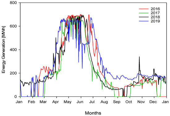 Figure 7 illustrates the daily energy generation of the hydropower plant for the time interval of 2016–2019, and it can be seen that energy generation in 2019 surpasses that of the other years. The daily total energy generation was derived by summing the hourly energy generation data acquired from Energy Exchange Istanbul (EXIST) [38]. The peak energy generation of HPP occurred from the end of May to the end of June due to the rains and melting snow, especially at the top of the mountains. The peak daily energy output reached an average of 700 MWh, consistently seen in the months of May and June over the whole study period. Energy generation rose in March and decreased at the end of June. In the winter season, especially between January and February, there were interruptions caused by the freezing of stored water in the regulator due to the low level. Similar interruptions arose between the end of August and October as a result of the inadequate flow rate.
