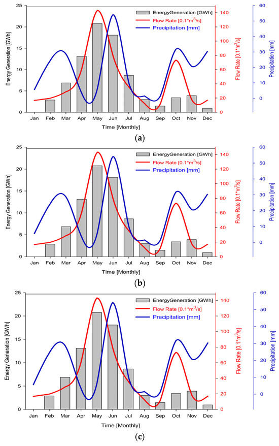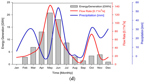 - The peak value of flow rate occurs during the spring season, composed of March–June, after the existence of the peak value of precipitation, which has a shifting pattern, and then energy generation likewise attains its maximum value during the same time interval. However, in the rest of the months, these exhibit distinct behaviors.