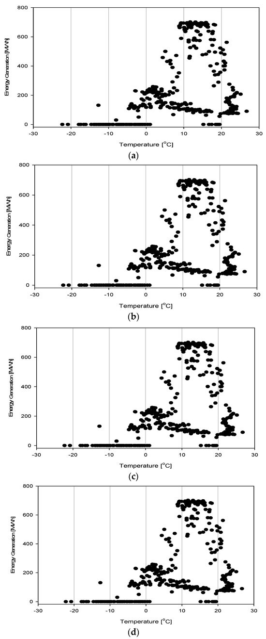 Alteration in daily energy generation with respect to temperature, (a) 2016, (b) 2017, (c) 2018, and (d) 2019.