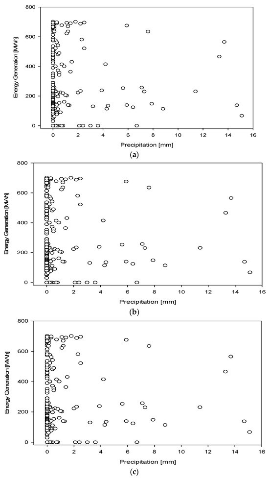 - There is no discernible correlation between daily precipitation and daily energy output. This finding does not imply the absence of a relationship between precipitation and energy output; as it was mentioned previously, monthly mean data trends of energy generation and precipitation have a strict relationship. The year with the greatest energy generation, as shown in this study, was 2019, coinciding with the year in which the highest precipitation levels were recorded.