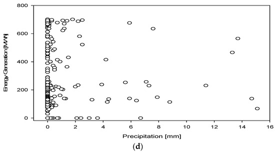 It is known that the energy generation of hydropower plants is heavily dependent on precipitation, given that these facilities operate by harnessing the flow of water. Therefore, the deviations in patterns of precipitation have the potential to induce fluctuations in river flow. Extensive periods of insufficient precipitation have the potential to diminish river flow, thereby exerting an influence on the energy generation capacity of hydropower facilities. On the contrary, substantial precipitation has the potential to enhance river flow, thereby optimizing the generation of hydropower. Figure 10a–d illustrate the variation in daily energy generation of Bagisli HPP in contrast with daily precipitation in the studied field for the given time interval. It should be noted that the given figures have been produced using the daily precipitation data and daily energy generations, which are the sources of the data mentioned before. It can be concluded from the figures that the daily precipitation has no impact on daily energy generation, which means there is no correlation between them. As can be seen in Figure 10a–d, energy generation can be achieved at a high level even on days when precipitation is 0 mm. The reason for this situation is that when the monthly total precipitation characteristics are examined, it takes time for the precipitation to be transmitted to the power plant as flow rate. As can be seen in Figure 8a–d, the effects of snowfall in winter and rainfall in spring are observed in the following days and months. In addition, when Figure 10a–d are analyzed, it can be seen that on some days there is no energy generation even though there is precipitation. This outcome does not state that precipitation has no impact on energy generation. Because, as given in Figure 8a,b evaluated before, which represent the variation in energy generation, flow rate, and precipitation using monthly mean data, the peak of flow rate occurs with the peak of energy generation after the peak of precipitation, which means monthly flow rate and energy generation follow the precipitation that occurred in the studied region. The highest energy generation among the studied years was attained in 2019, which had the highest precipitation value. This result clearly shows that precipitation has a direct effect on energy generation through river flow. Therefore, the unpredictability of precipitation and the possibility of alterations as a result of seasonal variations may incorporate unpredictability into the energy generation of hydropower plants over the long term.