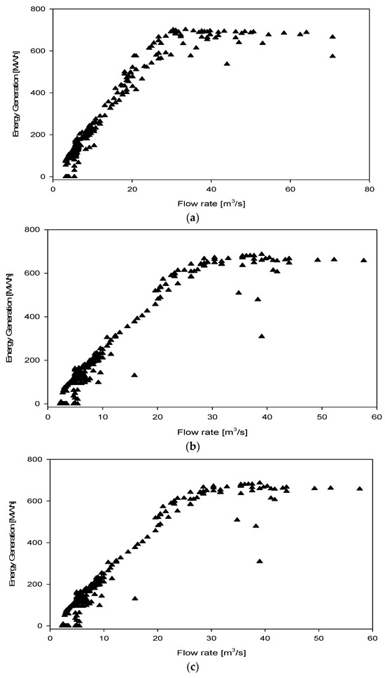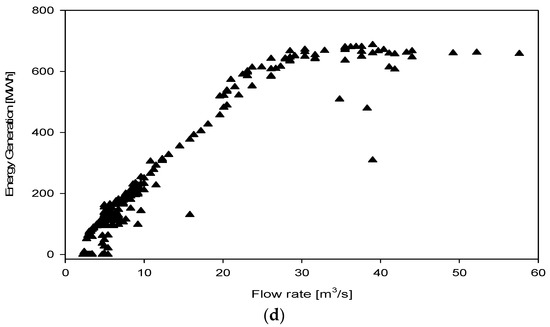 Figure 11a–d show the relationship between the daily energy generation at the power plant and the daily flow rate of the river on which the power plant is located. As can be seen in the figure, there is a linear relationship between daily flow rate and daily energy generation, unlike the relationship between daily rainfall and daily energy generation. This linear relationship continues until the power plant’s design flow level is reached. As mentioned in the Section “Characterization of Studied Area”, the design flow of the studied hydropower plant was determined to be 31.24 m3/s, given in Table 1, which means the maximum energy generation can be produced using this value. The flows that arose in the river over the design value were directed to the spillways. In the given Figure 11a–d, at some points, while the flow rate passes the design flow value, the generated energy does not reach its highest value. The reason behind this outcome is the maintenance of the whole system, including turbines. It can also be concluded that, in the presence of low flow rates, energy generation is also interrupted. In addition, the relationship between the monthly total energy generation at the power plant and the monthly total flow rate is given in detail in the section where Figure 8a–d are interpreted.
