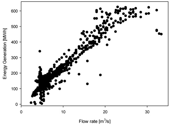 where the given parameters are P, , , , and , which represent the produced power [kW], general efficiency, density of water [kg/m3], ground acceleration [m/s2], flow rate [m3/s], and net head [m], respectively. The values of the mentioned parameters in the given equation are nearly constant except for flow rate, which changes instantaneously. According to Linder et al. [41], there is a clear relationship between hydropower energy generation and stream flow (flow rate) that can be accurately represented using a statistical model. From this point of view, a novel linear correlation with an R2 value of 0.89 has been produced, given in Equation (2), using the long-term daily flow rate data and daily energy generation of the investigated hydropower plant. The only variable parameter is flow rate for the proposed equation, derived by implementing more than 1000 data points, covering 2016–2018, as shown in Figure 12.