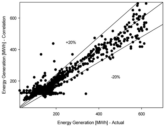 where P and Q are the energy generation [kW] and flow rate [m3/s], respectively. In Figure 13, the obtained energy generation values using the proposed correlation have been compared with the actual energy generation values of the same power plant for 2019, and it can be seen that the deviation band of the equation is in the range of ±20%. The proposed correlation, derived using more than 1000 data points of daily flow rates and energy generation, can be implemented in cases where there are only data on flow rates to obtain an estimation of energy generation.