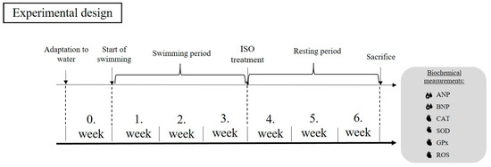 For the implementation of the swimming exercise, a specialized swimming apparatus, designed for the purpose of the experiment, was utilized. The glass apparatus was specifically tailored for swimming rats. It was filled with tap water and maintained at a 30–32 °C temperature and was monitored with a thermometer. In addition, besides the appropriate temperature, the purity of the water was also constantly surveyed. The 70 cm height of the apparatus ensured that the rats’ tails could not reach the bottom of the pool. The animals swam solitarily in separate chambers every morning for 25 min. Once the training was completed, the animals were carefully removed from the apparatus, towel-dried, and returned to their cages. Pre-swimming training meant that the animals swam for 3 weeks before ISO administration. CTRL and ISO animals did not perform the exercise. The swimming training was preceded by one week of adaptation to the water, to minimize the stress response. On the first day, the animals spent 5 min in the water, then with each passing day, the exposure time was increased by 5 min. The rats that showed no interest in swimming were subsequently removed from the experiment. Given that there was no extra weight attached to the animals’ tails, the intensity of the exercise can be defined as moderate. At the end of the experiment, rats were euthanized, and their blood specimens were collected with their excised hearts. Serum and cardiac tissues were used for several biochemical measurements. Every aspect of the experimental protocol was thoroughly reviewed and approved by the Welfare Committee of University of Szeged (XX./1405/2021).