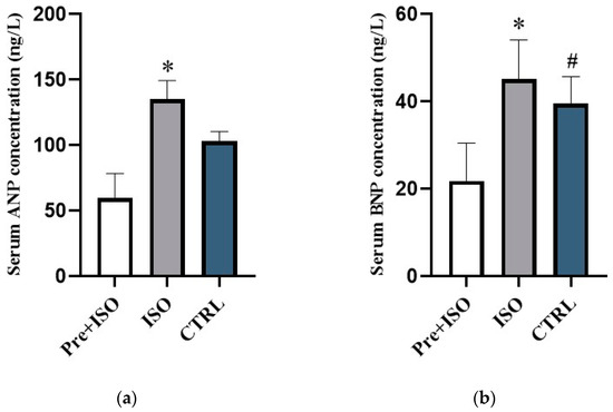 (a) The effects of swimming training on cardiac ANP concentration (ANP; expressed as ng/L). Results shown as means ± S.E.M. n = 5–7. *: p < 0.05 statistical comparison between ISO and Pre + ISO groups. (b) The effects of swimming training on cardiac BNP concentration (BNP; expressed as ng/L). Result shown as means ± S.E.M. n = 4–5. * p < 0.05 statistical comparison between ISO and Pre + ISO groups. #: p < 0.05 statistical comparison between ISO and CTRL groups. Pre + ISO = pre-swimming training + ISO treated; ISO = isoproterenol-treated; CTRL = control; ANP = atrial natriuretic peptide; and BNP = B-type natriuretic peptide.