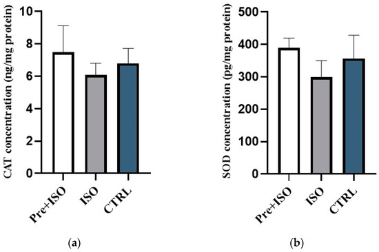 As shown in Figure 3a,b, antioxidant parameters such as CAT and SOD increased in the Pre + ISO group compared to the ISO group; however, these changes could not be considered significant. Three-week-long swimming training had a visible impact on antioxidant enzymes detected in the heart tissue. While the values of the ISO group were diminished as a result of myocardial damage; preventive exercise protocol before infarction was able to mitigate these adverse changes.