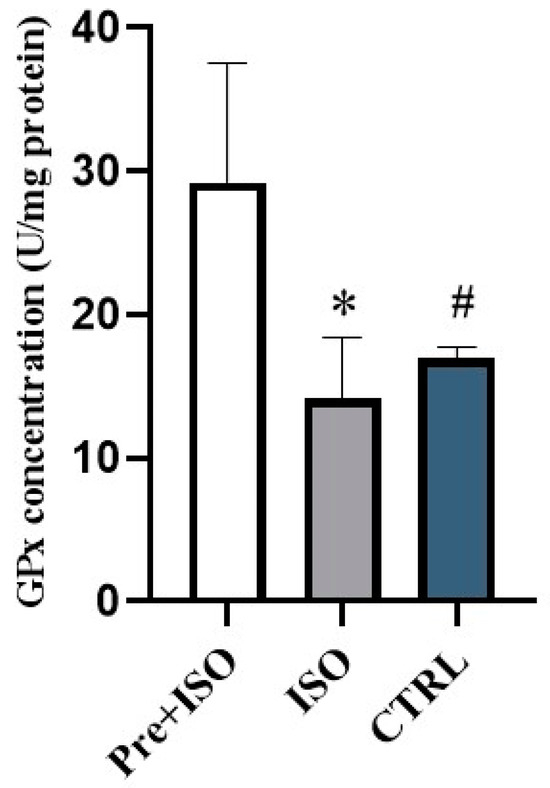 The effects of swimming training on cardiac GPx concentration (GPx; expressed as U/mg protein). Results shown as means ± S.E.M. n = 4–6. *: p < 0.05 statistical comparison between ISO and Pre + ISO groups. #: p < 0.05 statistical comparison between ISO and CTRL groups. Pre + ISO = pre-swimming training + ISO treated; ISO = isoproterenol-treated; CTRL = control; and GPx = glutathione peroxidase.