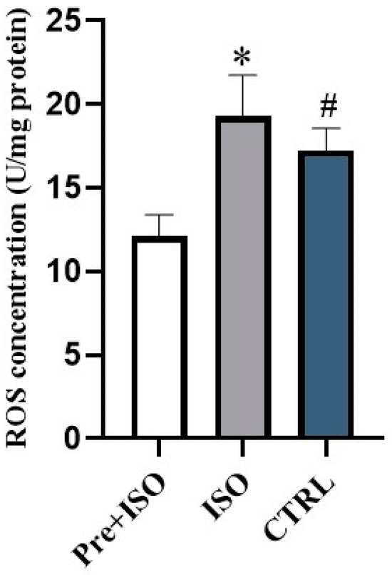 Assuming the cardiovascular protective effects of exercise, total ROS concentration was measured in heart tissues as seen in Figure 5. ISO-treated rats possessed significantly higher ROS levels in comparison with the CTRL group, whereas 3 weeks of the swimming protocol prior to infarction resulted in a significant mitigation of the elevated ROS concentrations compared to the sedentary ISO group.
