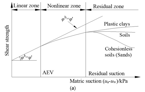 The shear strength of soil in unsaturated states is conventionally depicted in a linear fashion; nevertheless, a substantial corpus of empirical evidence attests to the pronounced nonlinearity exhibited by shear strength of soil in unsaturated conditions, particularly when subjected to the effects of matric suction [44,45]. This article posits several nonlinear equations to delineate the inter-relation between the shear strength of unsaturated soil and matric suction. Zhang et al. [46] encapsulated a selection of emblematic nonlinear equations, as shown in Table 1. In this context, signifies saturation, while signifies residual saturation. , , and correspond to volume moisture content, saturated volume moisture content, and residual volume moisture content, respectively. Furthermore, designates the ultimate undrained soil shear strength in a desiccated state, and designates residual matric suction. And AEV refers to the Air Entry Value.