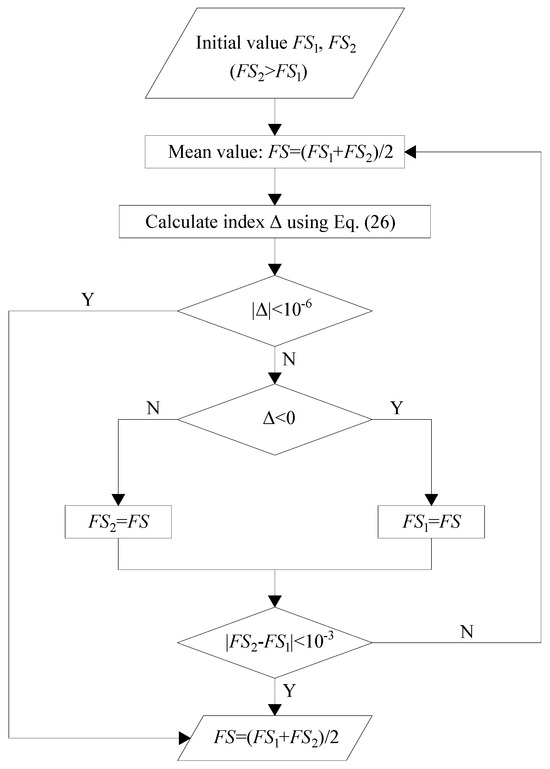 The SRM is utilized to formulate an implicit equation [50]. In this paper, the FS is derived through a binary search approach. The flowchart depicted in Figure 4 elucidates the principles of this method. A parameter without dimensions has been included to facilitate computation, as outlined below: