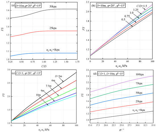 Figure 7 depicts the FS of the tunnel face, considering uniform matric suction, where represents a constant. Figure 7a delineates the correlation between the FS and the burial depth ratio C/D for scenarios with D = 10 m, 0, 25, and 50 kPa. Figure 7b and Figure 7c, respectively, present the FS for different values of C/D and D. Figure 7d demonstrates the influence of the internal friction angle of the soil on the FS at varying matric suction levels.