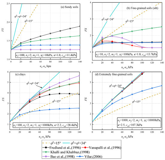 In the case of clay, when matric suction remains within 40 kPa, the trends of variation for all nonlinear curves, except for the Vilar model, are largely consistent with . Subsequently, the growth trends of the curves become more gradual. Only the curve for Vilar et al. (2006) [39] falls below and ultimately levels off. For ultra-fine grained soil, apart from the Vilar model, the safety factor curves are essentially consistent with the safety factor curve at , and the nonlinearity can be considered negligible. This aligns with the findings of Zhang et al. (2014) [46] regarding larger AEV values. These curves are all significantly higher than the curve at . From the comparison in Figure 9, it can be concluded that matric suction has the most significant impact on ultra-fine grained soil, followed by clay and silt, while its effect on sandy soil is the least pronounced.