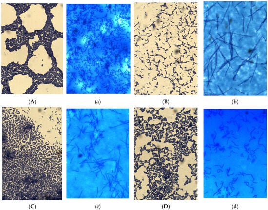 Cell morphology of the isolates grown on MRS-agar (capital letters) vs MRS-broth (small letters). Isolates Ech1 (A,a), Ech3 (B,b), Ph1 (C,c), and Ph3 (D,d). Methylene blue staining, 1000 × magnification.