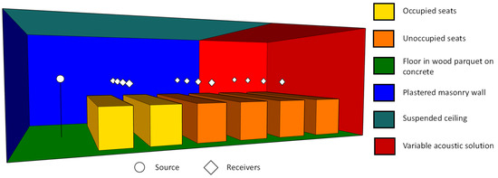 Geometry of the case study room, including the identification of all the lining materials and the location of the source and receivers (created using SketchUp 3D design software). In this figure, a case with one-third seat occupation is illustrated.