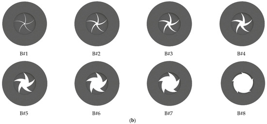 Schematic representation of the possible configurations for the tunable solutions assumed in the parametric study: (a) TS-A (hole distribution patterns A#1 to A#5) and (b) TS-B (diaphragm openings B#1 to B#8).