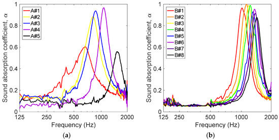 Measured sound absorption coefficients for each of the analyzed configurations: (a) TS-A and (b) TS-B.