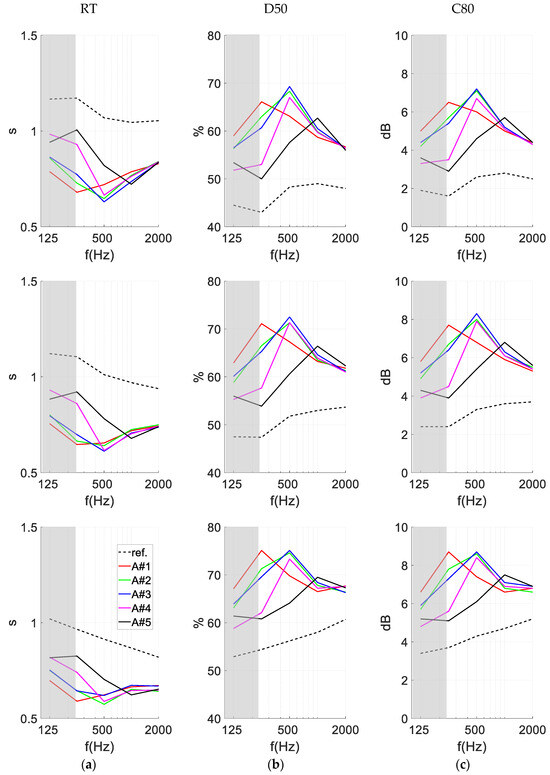 Average results of the case study room simulated using the ray tracing method for each of the five configurations of variable solution TS-A and different occupancy levels: (a) Reverberation Time, RT; (b) Definition, D50; and (c) Clarity, C80 (top: empty room; center: one-third occupation; and bottom: full occupation). Gray shade indicates frequencies outside the domain of validity.