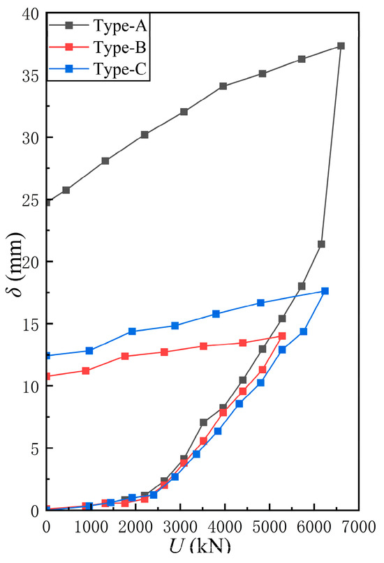 Figure 1 illustrates the displacement curve of the pile top under uplifting loads for the three sets of test piles. In this depiction, the variable U signifies the pile-top load, while δ represents the pile-top uplifting displacement. The load–displacement curve of the Type-A test pile displays a steep profile, while those of the Type-B and Type-C test piles exhibit gentler characteristics. During the initial loading phase, the Type-A pile’s top displacement increases nearly linearly with the growing uplifting load. However, as the uplifting load surpasses 6160 kN, the uplifting displacement experiences a sudden change, marking a distinct turning point. As per the Technical Code for the Testing of Building Foundation Piles (JGJ 106-2019) [23], this turning point designates the onset of a significant increase in the single pile’s ultimate carrying capacity for the Type-A pile. In contrast, the vertical displacement of the pile tops for the Type-B and Type-C piles exhibits consistent and gradual increases at each loading level, devoid of abrupt variations. According to the specifications, the determination of the ultimate bearing capacity for each test pile should be based on the load value at the preceding level where the δ-lgt curve’s slope exhibits a notable increase or the curve’s tail displays a significant bend. Therefore, the ultimate load results of the static load test for each pile are shown in Table 2. It is important to note that the alteration in the measurement method for displacement only impacts the displacement data of the composite-anchor piles. Consequently, the displacement data for Type-A remains unchanged from previous articles, while the displacement data for Type-B and Type-C are derived from this experiment.