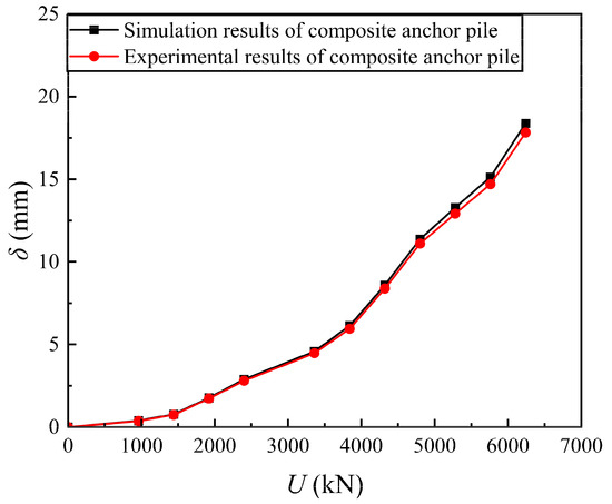 Furthermore, load test curves conducted on site demonstrate that the displacement curve of the pile top during the loading of composite-anchor piles exhibits a gradual change over time, indicating a more uniform stress transfer. An analysis of load-bearing capacity parameters obtained from a numerical simulation reveals that modifying the structure of the composite-anchor cable within the pile can effectively enhance the overall load-bearing capacity of the uplift pile. From an economic and environmental perspective, altering the structure of the internal anchor cable not only simplifies construction and reduces construction time, but also minimizes damage to the surrounding soil, ensuring soil stability.