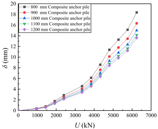 Figure 5 illustrates the load–displacement curves of Type-C for various pile diameters. Upon scrutinizing the figure, it is evident that augmenting the pile diameter from 800 mm to 1200 mm yields a 26% increase in the bearing capacity of the composite-anchor pile. However, when evaluating each 100 mm increment in the pile diameter individually, the uplift pile’s bearing capacity merely elevates by 11% when the diameter reaches 900 mm. Additionally, as the pile diameter continues to increase, the rate of improvement in the uplift pile’s bearing capacity diminishes. This implies that while expanding the pile diameter enhances the bearing capacity to a certain extent, there are limitations to its growth rate.
