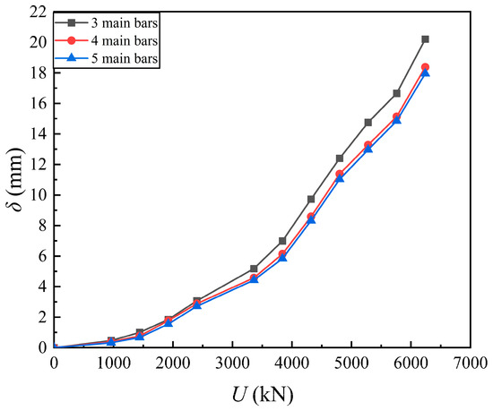 The composite-anchor cable is the main reinforcement structure of the composite-anchor pile. To assist construction professionals in selecting suitable uplift pile configurations based on varying real-world project conditions, finite element simulations were conducted using three, four, and five composite-anchor cables. Figure 6 illustrates the changing trend of the pile top load–displacement curve in the three sets of simulations. It is evident from the figure that when comparing three composite-anchor cables to four composite-anchor cables, the pile top displacement decreases by 2 mm, and the bearing capacity increases by 10%. However, if the number of anchor cables is further increased to five, the pile top displacement only decreases by an additional 0.5 mm, and the bearing capacity only increases by 2%. In general, under these conditions, increasing the number of anchor cables effectively enhances the bearing capacity of the composite-anchor pile when the number of cables is less than four. However, when the number of anchor cables is four or more, having too many cables can lead to a wasted partial bearing capacity and increased cost burden. Furthermore, the composite-anchor pile is a more intricate structural component compared to the overall foundation, and having an excessive number of anchor cables may increase manufacturing difficulty and labor costs. Additionally, the fixed cross-section of the pile results in a higher reinforcement ratio when the number of cables is increased, which can lead to brittle failure under extreme loading conditions and compromise the overall stability of the structure. Therefore, conducting a comprehensive analysis and cost-benefit assessment to determine the optimal number of anchor cables for a specific project is crucial.