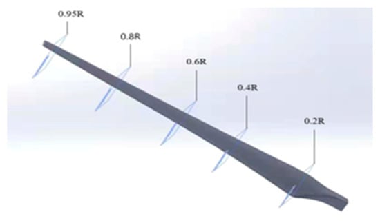 In order to obtain the iced blade airfoil shape under different icing conditions, the airfoil shapes in a 0.2R section of nine icing blades are taken for comparison. Figure 6 shows the location of the taken airfoil sections; Figure 7 shows the comparison of each section of the airfoil.
