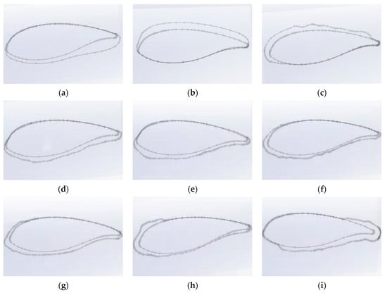 Comparison of airfoil shapes for different icing conditions for 0.2R cross-section: (a) Icing on the windward side of 1.0 kg; (b) Icing on the leeward side of 1.0 kg; (c) Icing on the leading edge of 0.65 kg and the different angles of attack: (d) 0°; (e) 15°; (f) 30°; (g) 45°; (h) 60°; (i) trailing edge.