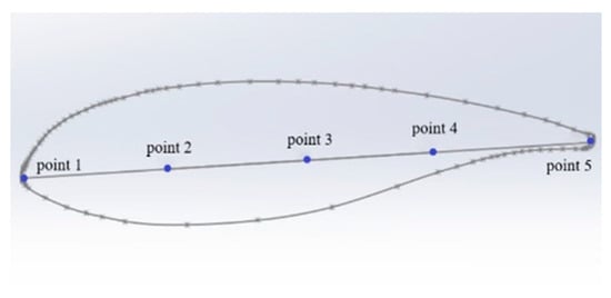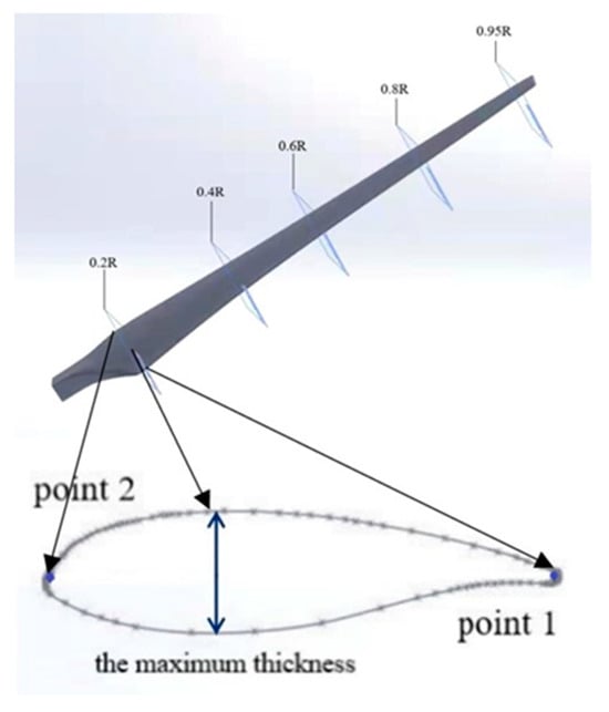 In order to accurately describe the effect of icing on the geometrical parameters of the airfoil, the chord length was divided into four equal parts at 0.2R, 0.4R, 0.6R, 0.8R, and 0.95R of the un-iced blade, respectively, with five points distributed at chord length ratios 0, 1/4, 2/4, ¾, and 1, as shown in Figure 8. For the windward side icing, the thickness at five points of the perpendicular intersection is measured with the windward icing contour line. For the leeward side icing, the thickness at five points of the intersection is measured perpendicular to the leeward icing contour line. The trend of thickness changes is shown in Figure 9.