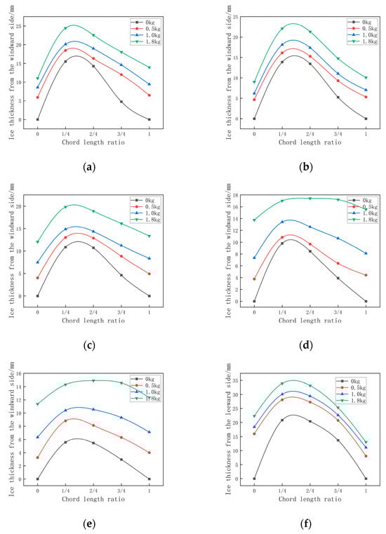 Changes in icing thickness trends along the blade spanwise direction, the windward side icing: (a) 0.5 kg; (b) 1.0 kg; (c) 1.8 kg and the leeward side icing: (d) 0.5 kg; (e) 1.0 kg; (f) 1.8 kg.