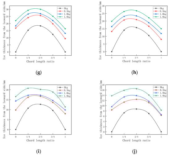 Distance between the upper and lower surfaces of the measuring points under different icing conditions, the windward side icing: (a) 0.2R; (b) 0.4R; (c) 0.6R; (d) 0.8R; (e) 0.95R and the leeward side icing: (f) 0.2R; (g) 0.4R; (h) 0.6R; (i) 0.8R; (j) 0.95R.