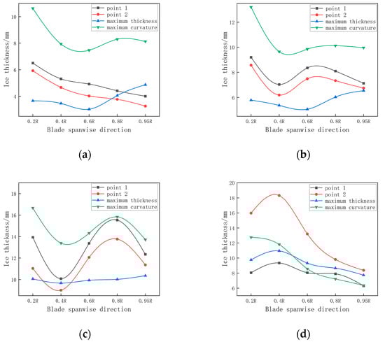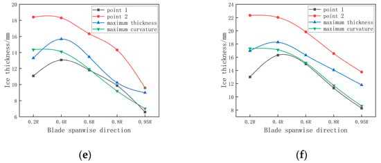 Using four measurement points at point 1 and point 2 and the maximum thickness in Figure 10, the thickness when not iced is subtracted from the measured thickness of the windward side and the leeward side under different icing conditions, and the change of icing thickness at 0.2R, 0.4R, 0.6R, 0.8R, and 0.95R along the blade spanwise direction can be obtained. The trend of icing thickness along the blade spanwise direction is shown in Figure 11.