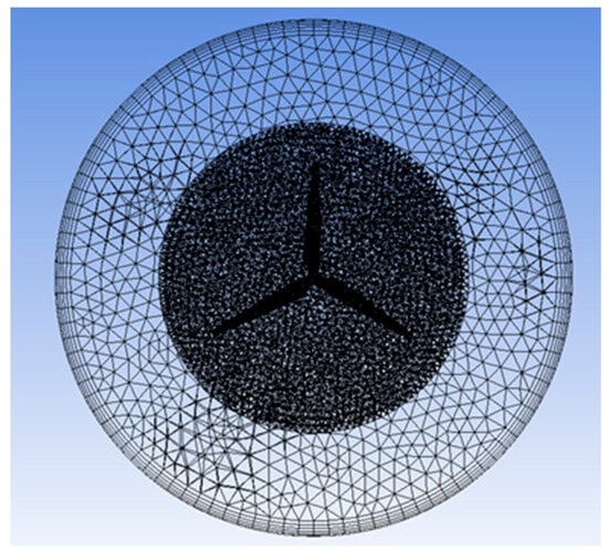 In order to study the effects of different icing conditions of blades on the aerodynamic characteristics of wind turbines, the wind turbine blade model obtained from icing experiments is used for simulation. The iced wind turbine model is imported into ANSYS 19.2 software for the creation of the inner and outer basins. Since the wind turbine model has rotational motion, the inner and outer basins were divided into the rotational domain and the stationary domain. The diameter of the wind turbine is 1.95 m. The inner basin is created as a cylinder of 3 m in diameter and 7 m in length, which is 2 m from the front surface of the wind turbine. The outer basin is a cylinder of 5 m in diameter and 35 m in length, which is 5 m from the front surface of the wind turbine. Through continuous debugging and irrelevance verification, it was determined that a total mesh number of about 2.6 million was appropriate. The grid division is shown in Figure 12.