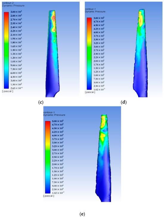 Blade pressure distribution under different icing conditions: (a) No icing; (b) Icing on the windward side of 1.8 kg; (c) Icing on the leeward side of 1.8 kg and the different angles of attack: (d) 30°; (e) 60°.