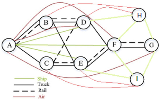 Multimodal Transportation Network in Iraq. Nodes A–I are interconnected using sea, raod, railways and air transportation sources.