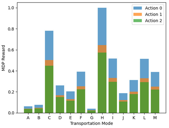 In Figure 3, the MDP rewards for 13 distinct transportation modes are presented, illustrating the nuanced evaluation of each mode’s performance within the multimodal transportation system. Each transportation mode is represented by a stacked bar showing the division of MDP rewards for three different actions. The rewards are derived from the integration of DEA efficiency scores, signifying the overall effectiveness of each mode based on predefined objectives. The normalization of rewards ensures a consistent and comparable scale, allowing for a meaningful analysis of the relative performance of different transportation modes. This figure provides a visual representation of how the multimodal transportation system is assessed holistically, considering factors such as infrastructure cost, fuel consumption, and employee-related metrics.