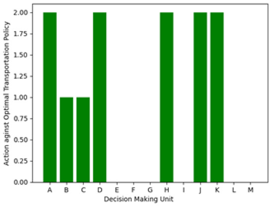 Figure 4 offers valuable insights into the decision-making process by showcasing the actions taken against the optimal transportation policy for each DMU. The optimal policy is determined through the combination of DEA efficiency scores and MDP rewards, resulting in a strategic approach to mode selection for each DMU. This figure provides a clear visualization of how the proposed framework guides decision-makers in choosing transportation modes that balance efficiency, cost-effectiveness, and environmental considerations. It serves as a practical tool for stakeholders to understand the recommended actions based on the integrated evaluation, facilitating informed and data-driven decision-making in the complex landscape of multimodal transportation.