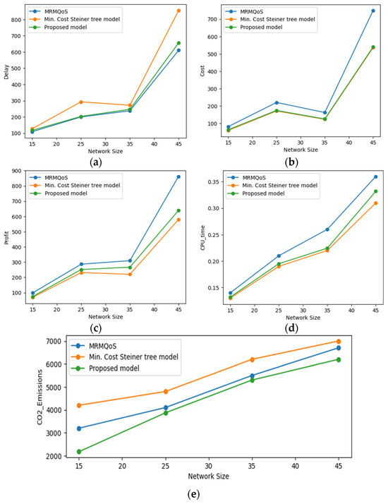 Comparison of proposed model, MRMQoS, and MCSTM in terms of cost, delay, profit, and CPU time against network size. (a) Cost, (b) Delay, (c) Profit, (d) CPU time, and (e) CO2 emissions.