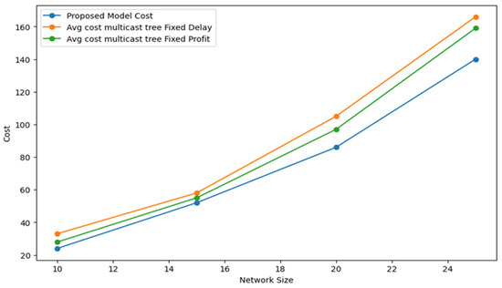 In certain instances, the imposition of QoS constraints on a chosen multicast tree often results in its rejection. Consequently, in the subsequent experiments, we explored an extension of our proposed approach wherein the overall weight of a multicast tree must also conform to a budget constraint. This problem is commonly identified as a constrained Steiner tree problem, well-known for its NP-hard nature [31]. A specific manifestation of this model is widely acknowledged as a constrained shortest path problem, a crucial challenge in optimization domains such as transportation, crew scheduling, network routing, and communication networks [32]. The constrained shortest path problem entails identifying the shortest path that adheres to specific constraints, such as delay and cost. Our proposed method was initially employed to calculate the cost, delay, and profit of the selected multicast tree. Subsequently, these metrics were compared with the multicast tree resulting from the variation in MRMQoS using two distinct strategies, with the aim of evaluating the solution quality of the proposed method. Figure 6 visually illustrates the cost comparison of multicast trees obtained for the proposed method and the variable MRMQoS, along with their two strategies. The results align with our expectations, highlighting the proposed method’s capacity to discover optimal multicast trees within a reasonable timeframe.