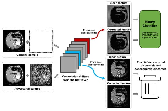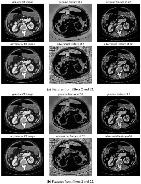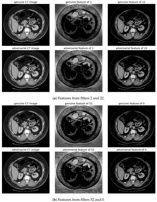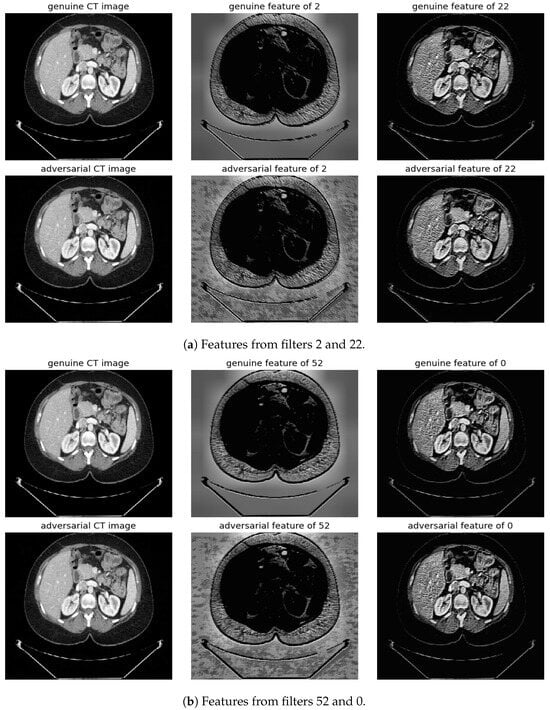 In the realm of medical imaging, especially with the widespread use of computed tomography (CT) scans for diagnostic purposes, the accuracy and integrity of the data have paramount significance. With the integration of deep learning techniques in the analysis of these scans, there emerges an opportunity for enhanced diagnostics [,,,]. However, alongside these advancements, there arises the vulnerability of adversarial attacks—meticulously crafted inputs meant to deceive deep learning models [,,]. Such perturbations, while often subtle and imperceptible to the human eye, can lead models to make incorrect predictions with potentially serious consequences in a clinical context []. Addressing this concern requires not only robust detection mechanisms but also intuitive ways for physicians to understand and counteract these adversarial inputs. By ensuring that medical professionals can visually discern genuine samples from their adversarial counterparts, it becomes possible to instill greater confidence in machine-assisted diagnoses and maintain the sanctity of patient care.
