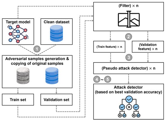 The detailed process of the adversarial detection from this work is described as follows. The steps are represented by numbered circles in Figure 3.