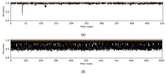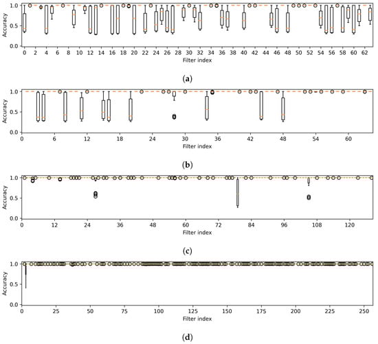 The first observation arises from the box plots illustrated in Figure 5. The box plots show the variability in detection accuracy across all attack methods. These are observed in the first layer, which constitutes the initial component, and in the intermediate layers corresponding to the subsequent components of the target model. The figure reveals a notable pattern: 15 out of 64 filters in the initial layer, including filters such as 2, 6, 8, and 10, consistently exhibit high detection accuracy with minimal variance. Interestingly, while the second, third, and fourth layers show remarkable stability with some filters (25 out of 64, 81 out of 128, and 54 out of 256, respectively) achieving perfect accuracy and zero variability, the fifth and sixth layers do not exhibit this trend, indicating a lack of zero variability filters and suggesting a more varied detection accuracy in these layers. However, the filters from the intermediate layers are not chosen, as elaborated in the following discussion.
